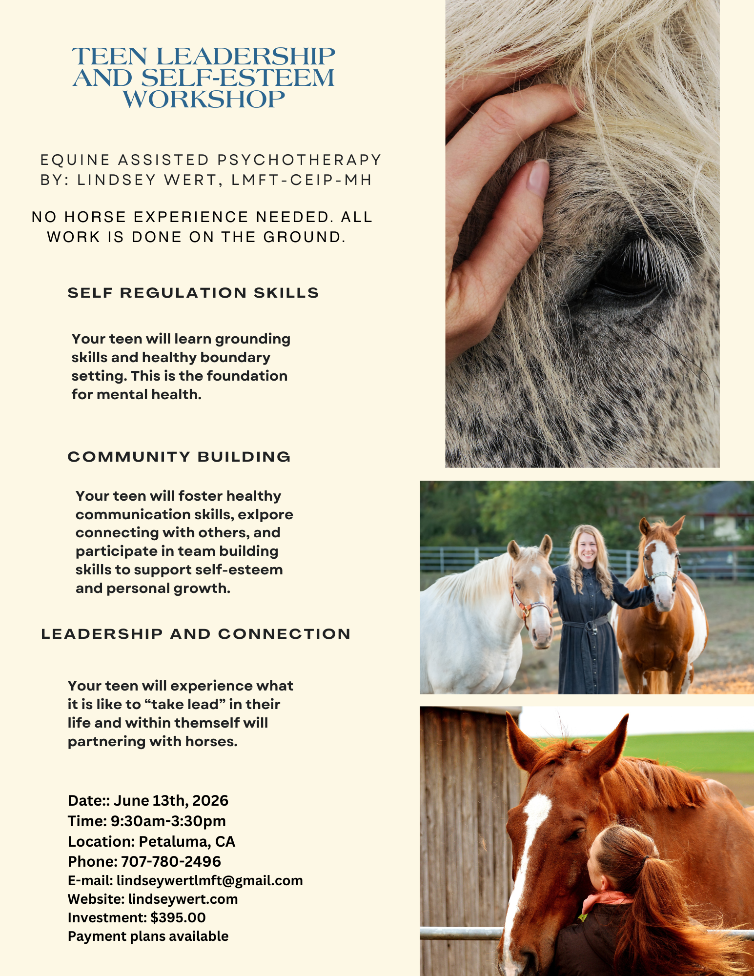Leadership and connection: Your teen will experience what it is like to “take lead” in their life and within themself will partnering with horses.