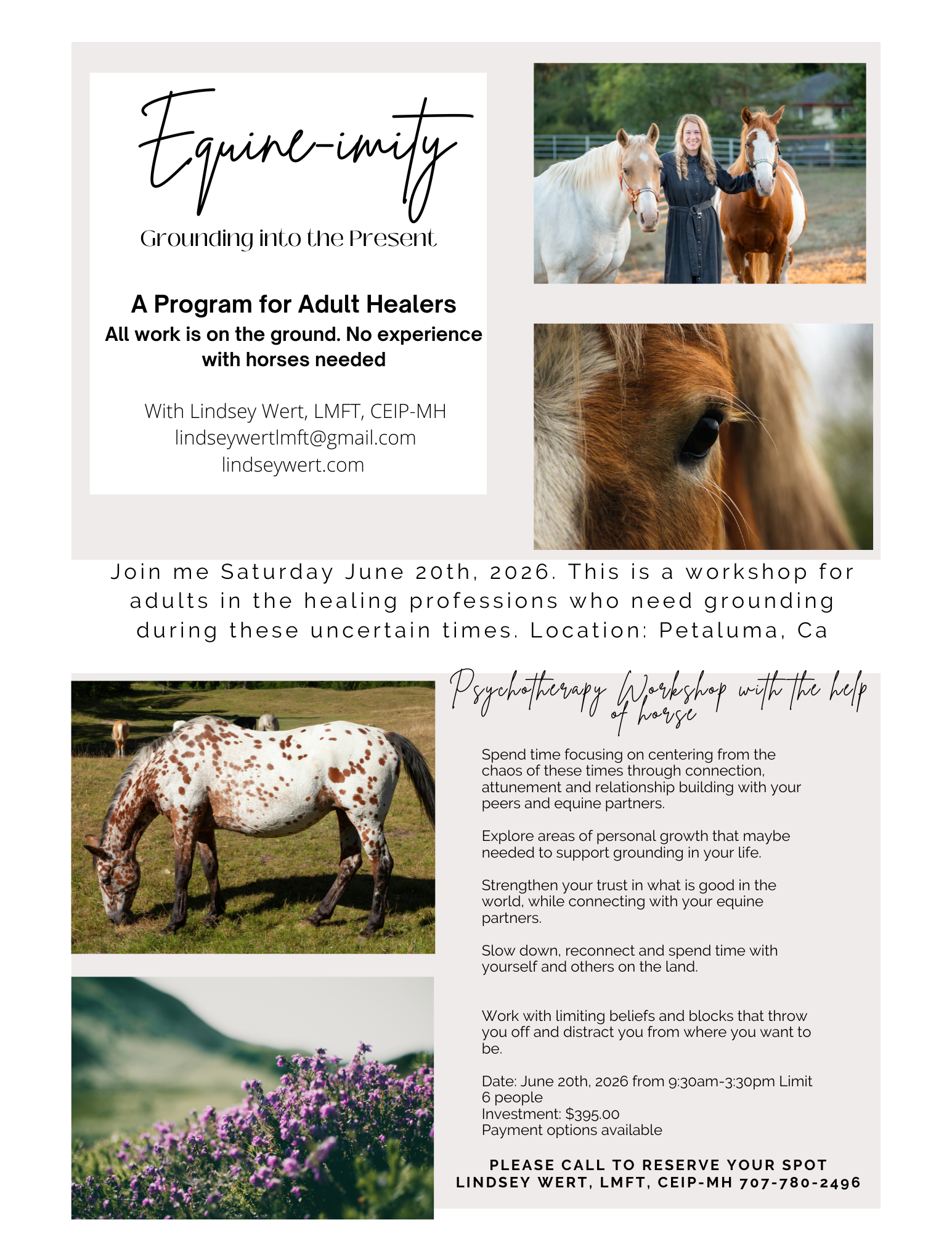 Spend time focusing on centering from the chaos of these times through connection, attunement and relationship building with yourpeers and equine partners.